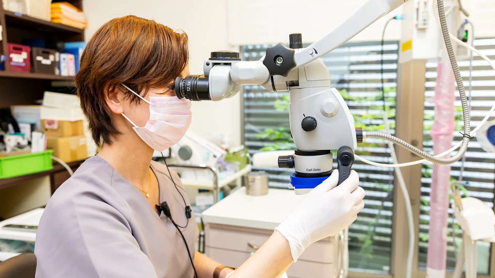 細部まで見逃さないよう、拡大鏡を使って精密に処置を行います。