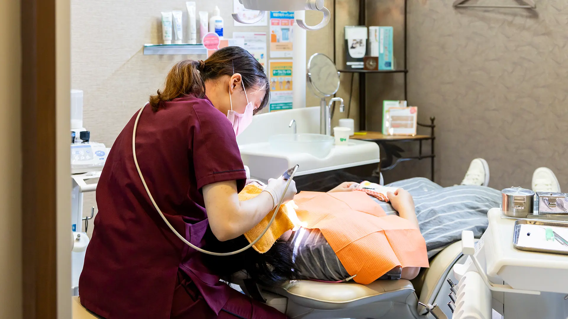 コンポジットレジンを確実に接着させるために、専用の機器や薬剤を使用して、歯の表面の汚れや不純物を丁寧に取り除きます。